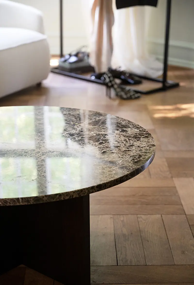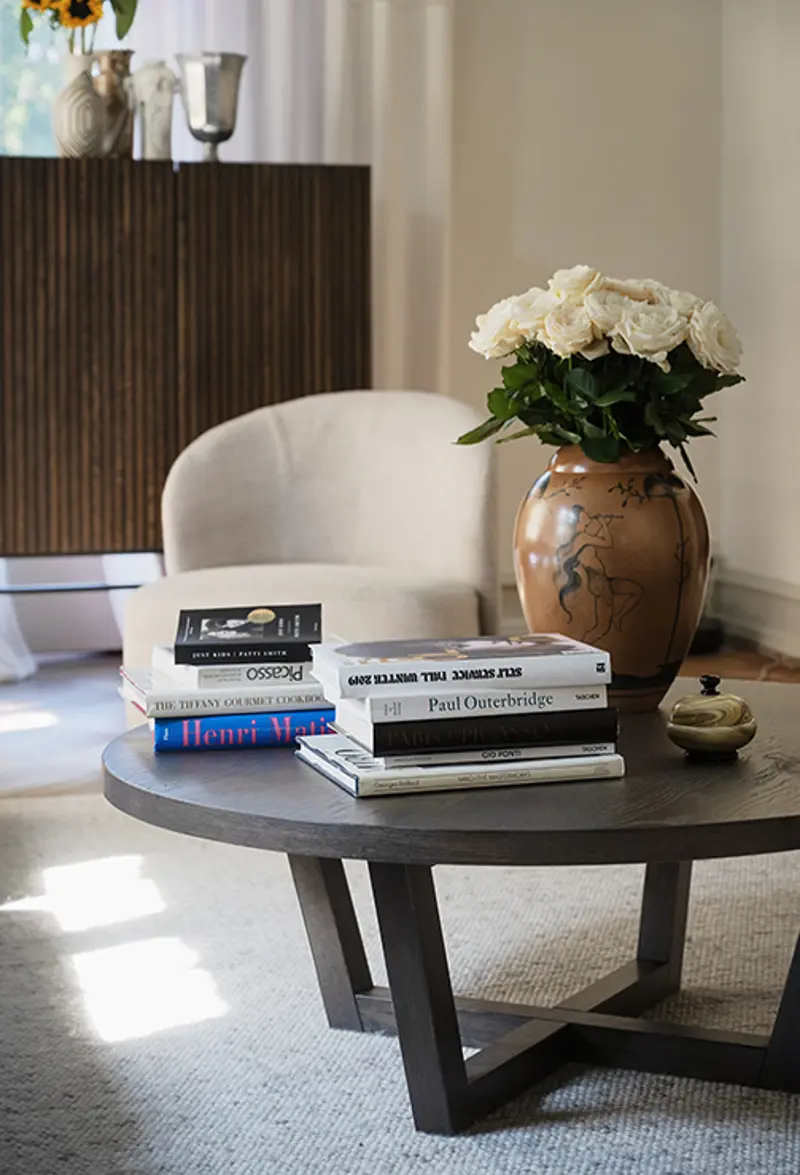 Mischen Sie die Farben mit zarten Vorhängen, die dem Raum ein luftiges und ausgewogenes Gefühl verleihen. Ergänzen Sie die Einrichtung mit Möbeln in neutralen Farben und einem Couchtisch mit einer dunklen Steinplatte, um Gewicht hinzuzufügen und Materialien zu mischen. Vergessen Sie nicht die Einrichtungsdetails – sie können entweder die Wandfarbe für einen zusammenhängenden Look anpassen oder völlig abweichen und eine einladende, persönliche Note schaffen.