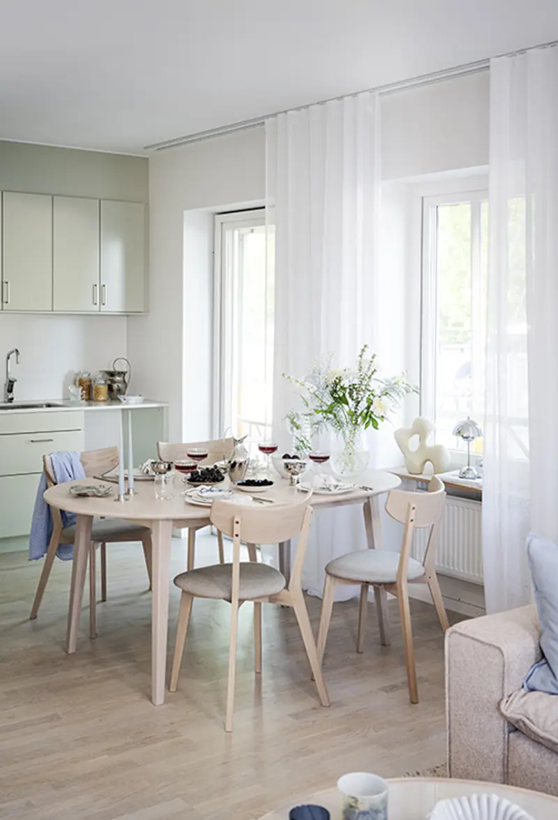 In einer kleineren Wohnung mit begrenztem Platz sind runde Esstische oder Klapptische mit schlanken, bequemen Stühlen absolut zu bevorzugen. Viele unserer runden Esstische können mit Hilfe einer Einlegeplatte vergrößert werden, um Abende mit Gästen zu ermöglichen. Wenn Sie die Möglichkeit haben, den Essbereich in der Nähe von Fensterpartien zu platzieren, wird dies ein angenehmer Platz mit Aussicht, an dem Sie sowohl im Alltag als auch bei Abendessen sitzen und essen können.