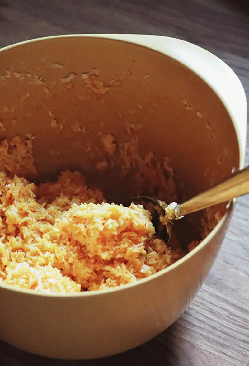 In a bowl, mix together eggs and granulated sugar, then add coconut, vanilla sugar, orange zest, and orange juice. Also stir in the saffron butter. Mix into a batter and let it swell for about 30 minutes.