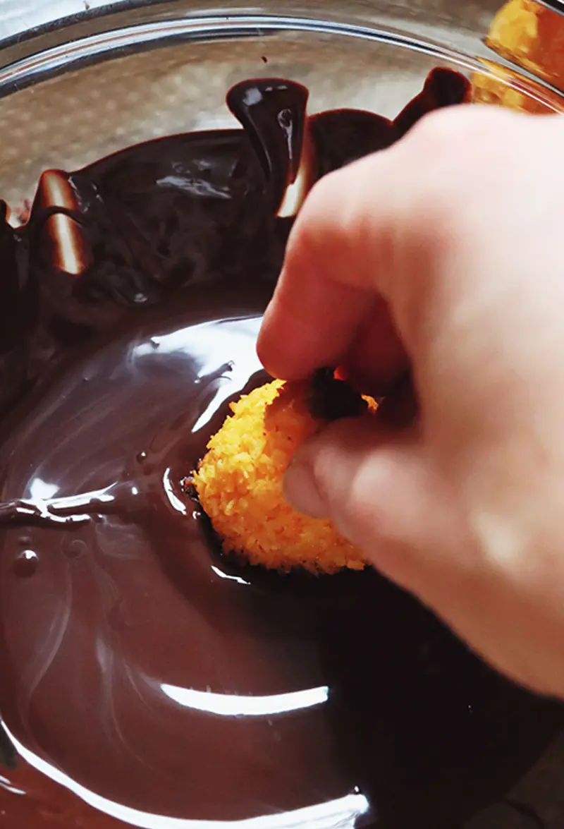 Dip the bottoms of the macaroons in the dark chocolate and let harden.