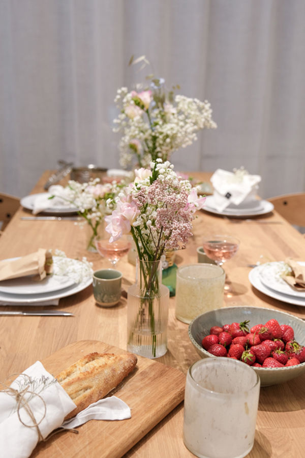 To avoid guests having to stretch a bit extra to see the person across the table, a simple trick is to place the vase with flowers on one side of the table instead of in the middle. The flowers and decorations still enhance the table setting with their often colorful presence but become more like a creative artwork that speaks for itself on the side, without disturbing the dinner or the neutral table setting.