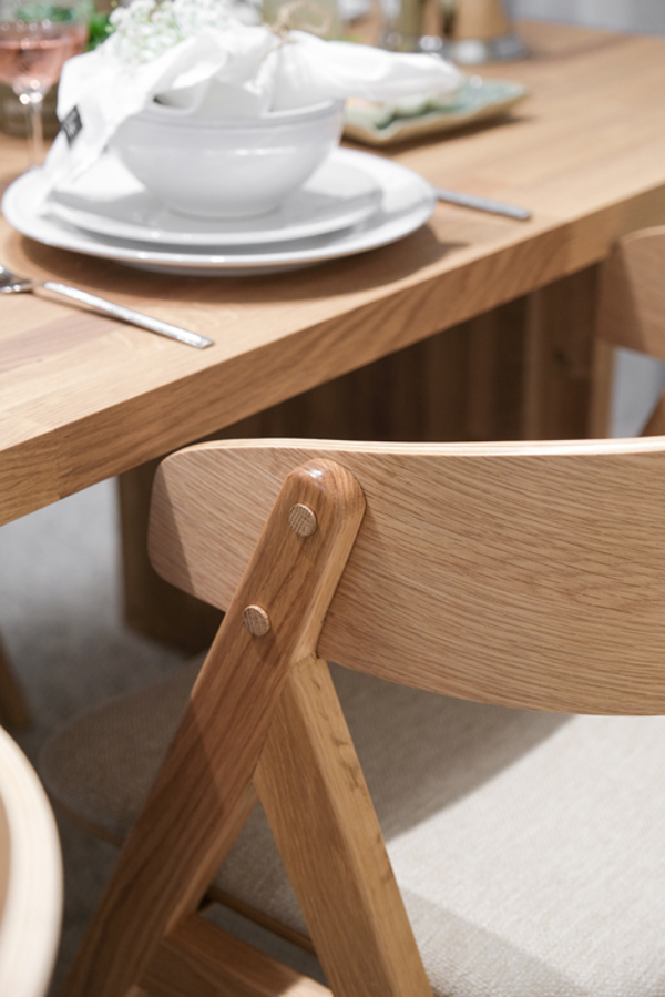 If you prefer a more neutral table setting, we recommend letting the furniture with chairs and table be the center of the dinner. Set the table with plates and bowls in a neutral color along with linen napkins that are simply and elegantly placed between the plate and the bowl.