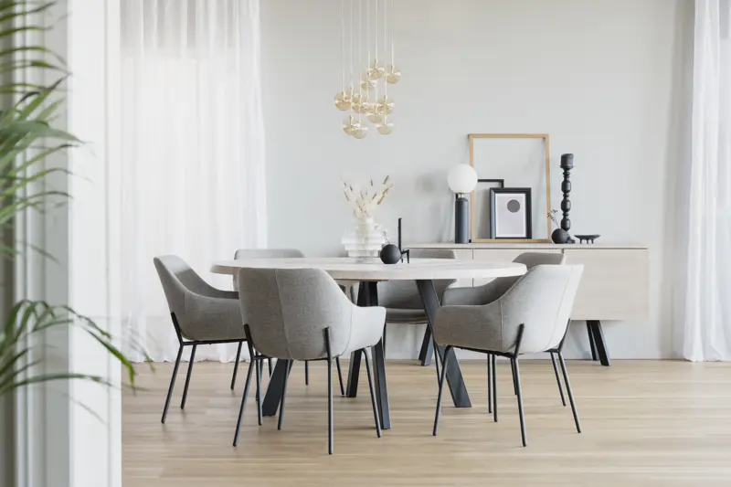 Modern and exclusive dining table with a two-part tabletop in 100% FSC® certified solid oak. The tabletop, which is whitewashed and lacquered, has a brushed surface and a stylish beveled edge. The legs consist of powder-coated black metal and are really stable and durable. A dining table that lasts year after year and is a good and sustainable choice. The table is also available as rectangular in two sizes, and a stylish sideboard is included in the series.