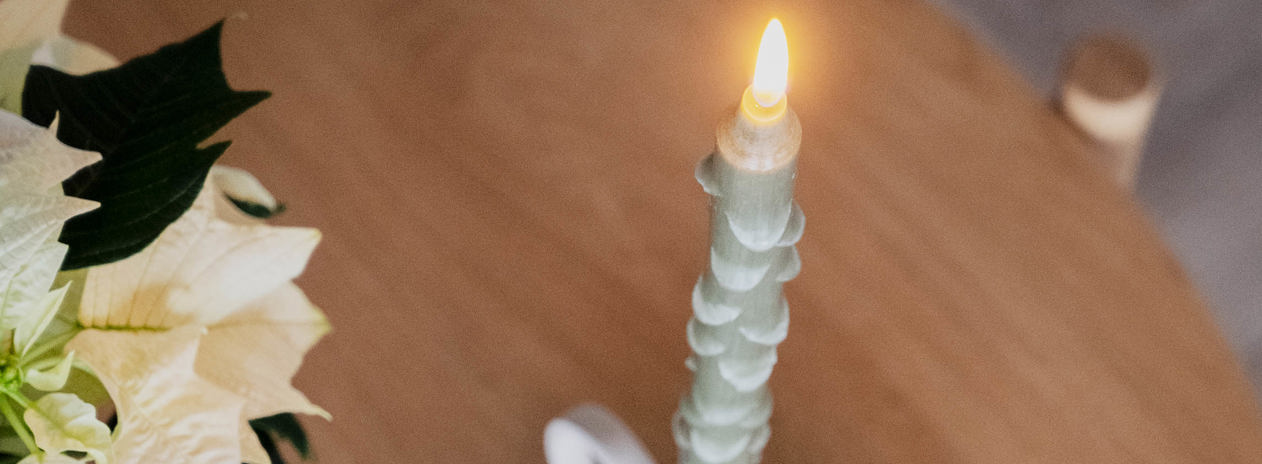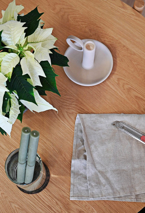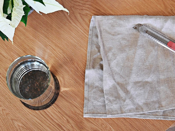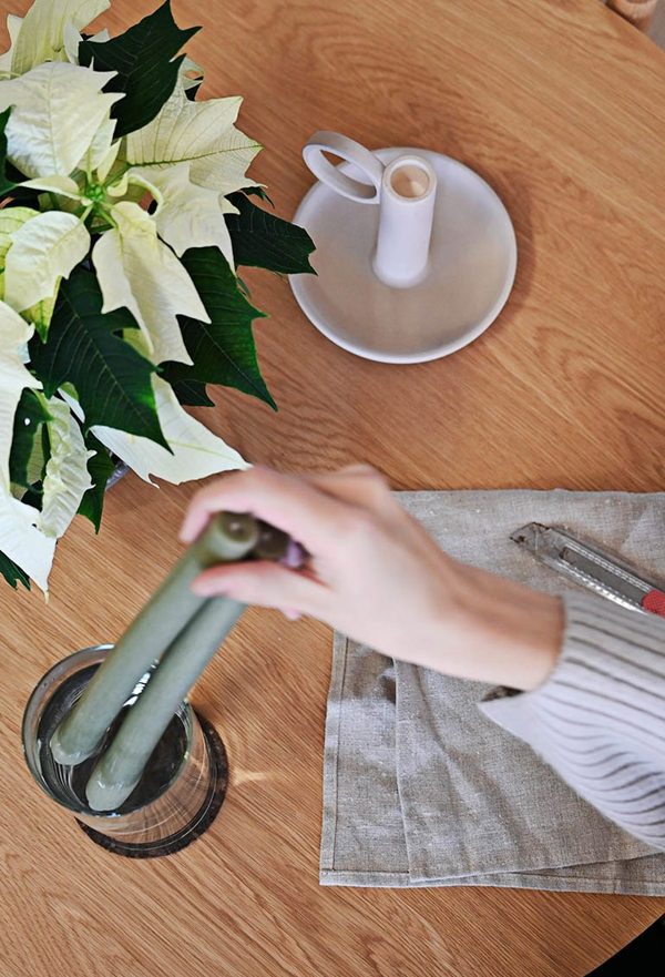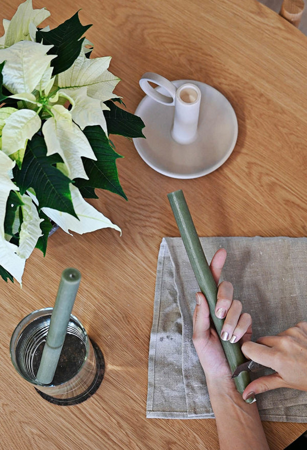 För att kunna skapa ett eget granljus är det bra att börja med att ta fram ljus i paraffin, en kniv och en hög vas med varmt vatten. Glöm inte heller att skydda bordet från väta om du har ett träbord.