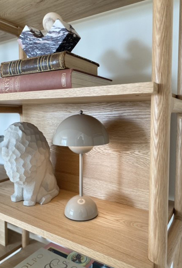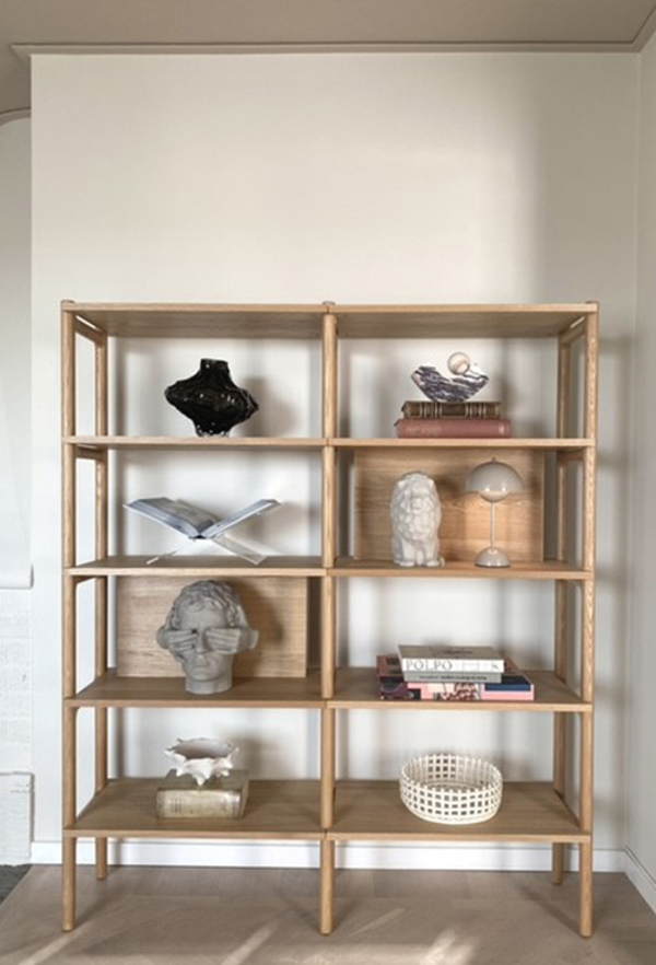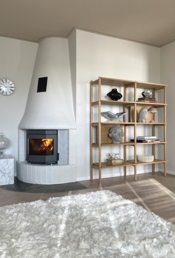 - Gällande hyllan så fastnade jag för det gedigna men ändå luftiga formspråket. Gillar verkligen de vackra och välarbetade detaljerna och att man kan variera utseendet på hyllan genom hur man stylar den. Norris soffa är både bekväm och snygg, de runda formerna ger verkligen karaktär åt hela rummet.