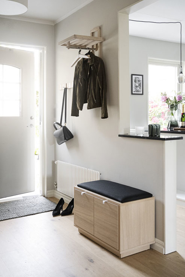 Malin har inrett med Rowico Home möbler i nästan alla rum, allt ifrån hallen till vardagsrummet till kontoret. I sovrummen har hon dock gjort speciallösningar och exempelvis byggt en alldeles egen säng i en sovalkov i sonens rum.