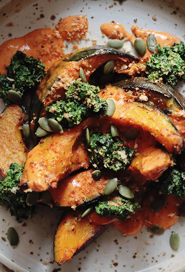 Lägg upp pumpan på tallrikar. Ringla över såsen och toppa med pesto, pangrattato och pumpakärnor.