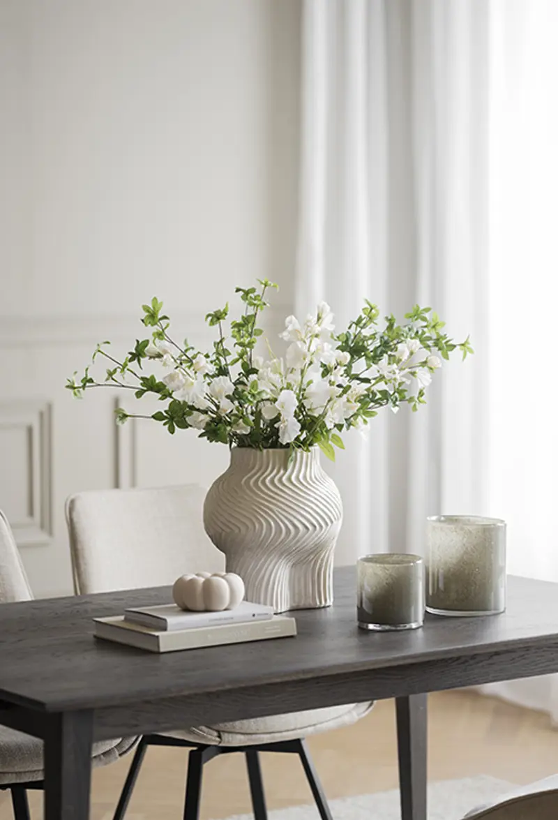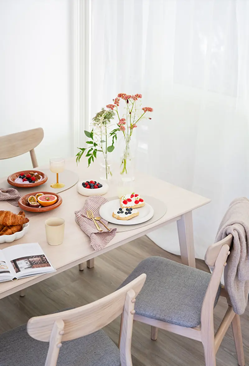 I kollektionen hittar du även runda matbord – den mjukt avrundade bordsskivan skapar en vacker kontrast mot de raka bordsbenen. De runda borden finns i tre olika träfärger: vitpigmenterat, naturek och mörkbrunt. Tack vare den medföljande iläggsskivan kan borden enkelt förlängas och förvandlas till ovala, vilket ger plats för fler runt bordet. Ett bord att växa med – både till vardag och fest.