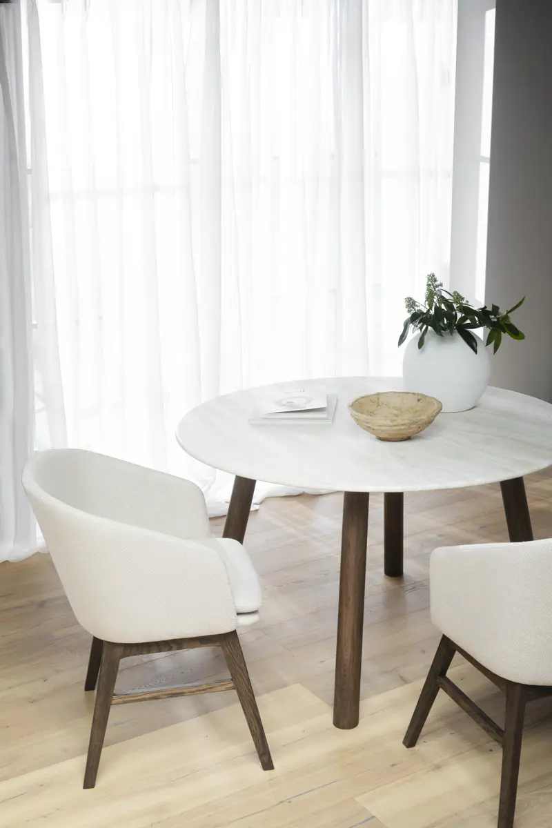 Lyxiga Taransay matbord har en exklusiv stenskiva av sandfärgad travertin från Italien och massiva ben av brunlackad FSC-certifierad ek. Travertin är en kalkstenstyp med fina skiftningar som ger bordet en naturlig skönhet och med tiden unik patina - där nya detaljer i bordskivan kan upptäckas varje dag. Bordets mjuka runda formspråk skapar en fin kontrast till den livliga och robusta stenskivan. Finns i flera utföranden. I kollektionen Taransay ingår även soffbord.