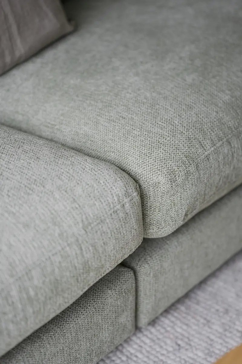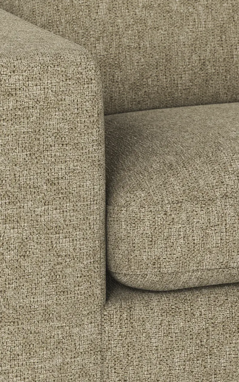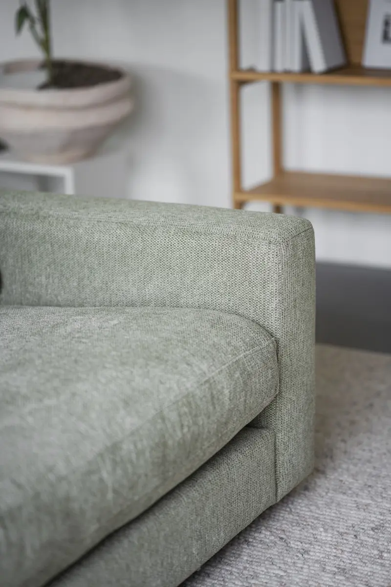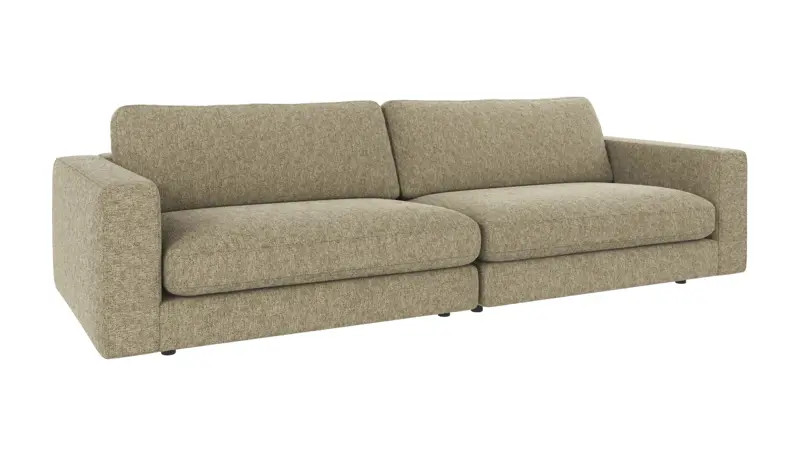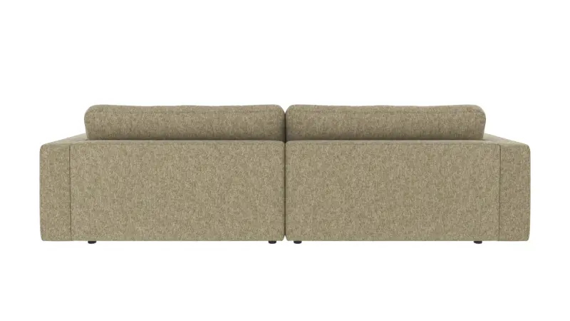 Frame in plywood and particle board, seat in zig-zag springs (Nozag). Frame upholstered with polyether foam, synthetic batting and fabric. Seat in High Resilience foam (cold foam), synthetic batting, and fabric. Back cushions in loose shredded foam mixed with polyester fiber balls, with fabric. Feet in black plastic H 50mm.