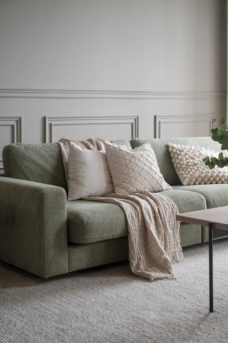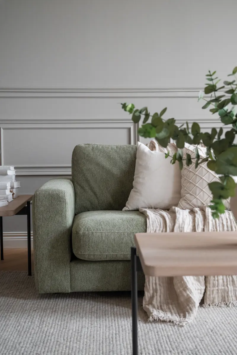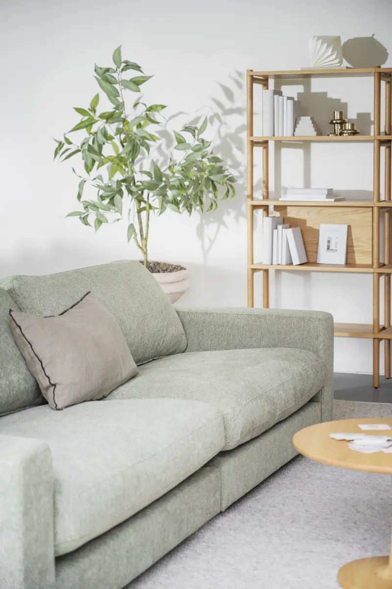 Frame in plywood and particle board, seat in zig-zag springs (Nozag). Frame upholstered with polyether foam, synthetic batting and fabric. Seat in High Resilience foam (cold foam), synthetic batting, and fabric. Back cushions in loose shredded foam mixed with polyester fiber balls, with fabric. Feet in black plastic H 50mm.