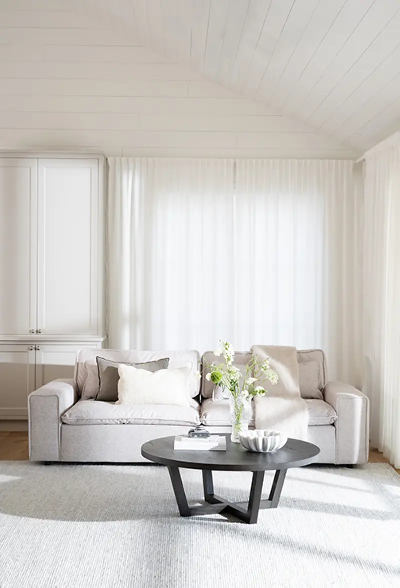 Vill du skapa en mjuk och enhetlig känsla, rekommenderar vi dig att välja en beige matta som matchar soffans nyans av beige. Försök att inte förblindas för mycket av att mattan och soffan måste vara exakt ton i ton, det är okej att de skiljer sig åt något, så länge de har en underton som går ihop. Kontrasterna skapar extra liv i inredningen som fortfarande harmoniserar.